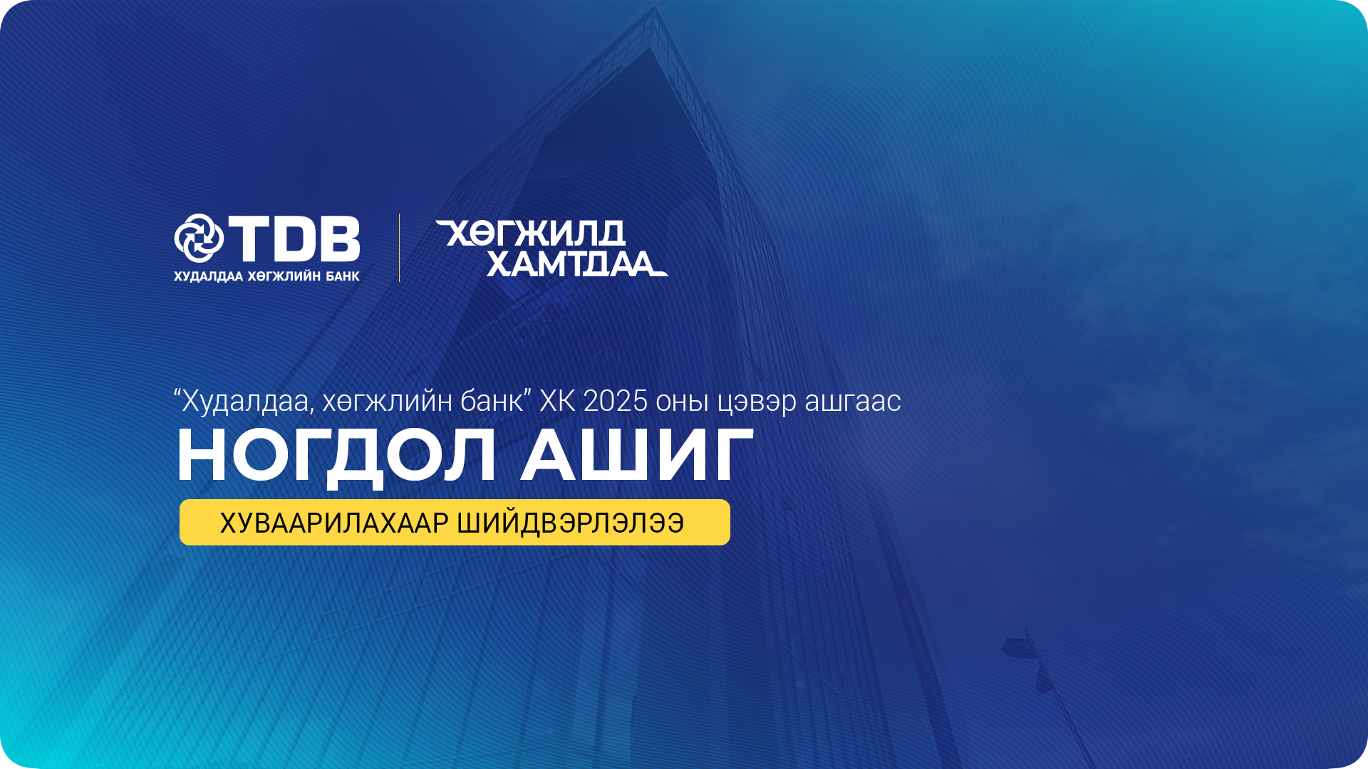 “Худалдаа, хөгжлийн банк” ХК‑ийн Төлөөлөн удирдах зөвлөл 2026 оны 3 дугаар сарын 23‑ны өдрийн 14 дугаар тогтоолоор Банкны 2025 оны цэвэр ашгаас ногдол ашиг хуваарилахаар шийдвэр гаргалаа. Уг шийдвэрийн дагуу нийт хувьцаа эзэмшигчдийн нэгж энгийн хувьцаанд 692.00 (зургаан зуун ерэн хоёр) төгрөгийн ногдол ашиг олгоно.